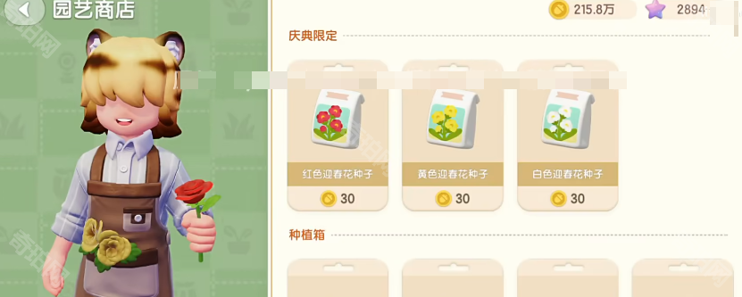 在布兰克的园艺商店中可以购买红、黄、白这3个基础颜色的迎春花种子