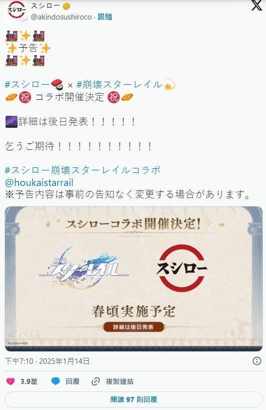 日本回转寿司店「寿司郎(あきんどスシロー)」2025年1月14日宣布,将与银河冒险策略 RPG《崩坏:星穹铁道》(PC / PS5 / PS4 / iOS / Android)在日本地区展开合作,预计将于 2025 年春季实施,将于日后发表详细合作情报。