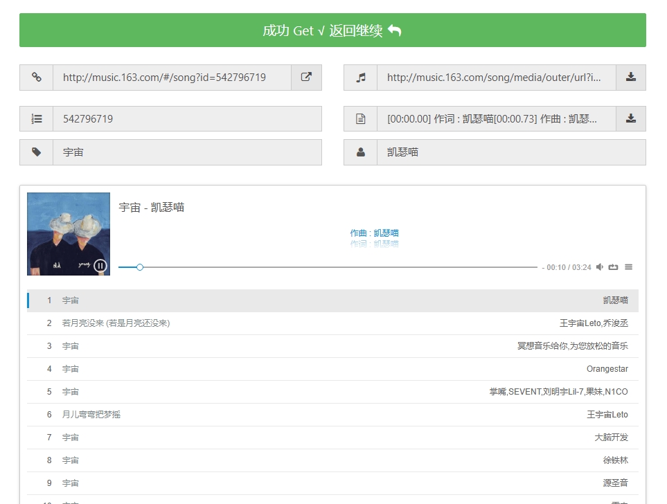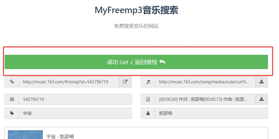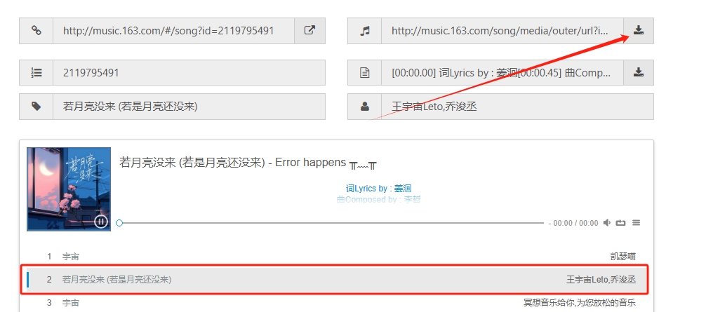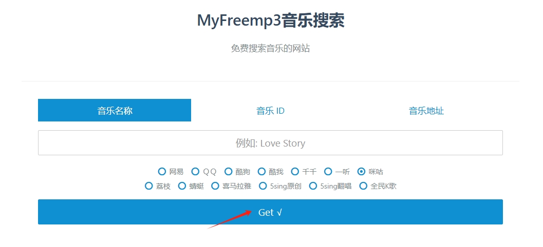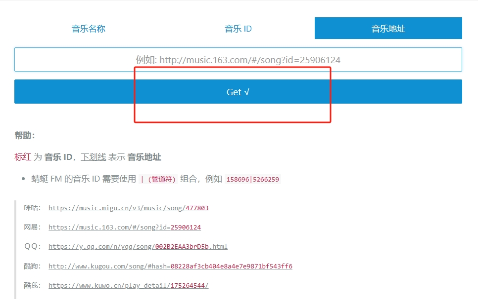 1、复制上方链接进入浏览器粘贴并跳转,然后输入歌曲名称点击“get”。