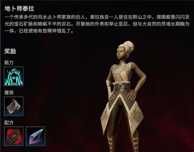 一个传承多代的风水占卜师家族的后人,泰拉独自一人居住在群山之中,周围都是闪闪发光的宝石矿脉和崎岖不平的巨石。尽管她的外表和举止坚忍,但与大自然的灵魂长期融为一体,已经使她有些精神错乱了。