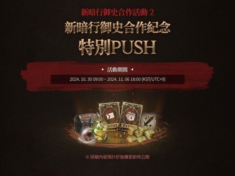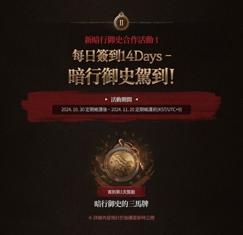 此外,同步展开每日签到 14 Days - 暗行御史驾到活动、新暗行御史合作纪念特别 PUSH 以及新暗行御史合作纪念公仔抽奖活动,将针对活动期间内获得「暗行御史的三马牌」的角色进行抽奖赠送公仔。