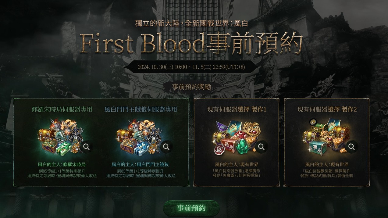 现有服务器可以获得「[传说] 风白门传说饰品 / 贵重物品箱、风白门门主的心脏、风白门服装:均衡、[传说] 混沌灵魂碎片 (25 个) 选择袋、First Blood 事前预约选择制作铸币」等奖励。
