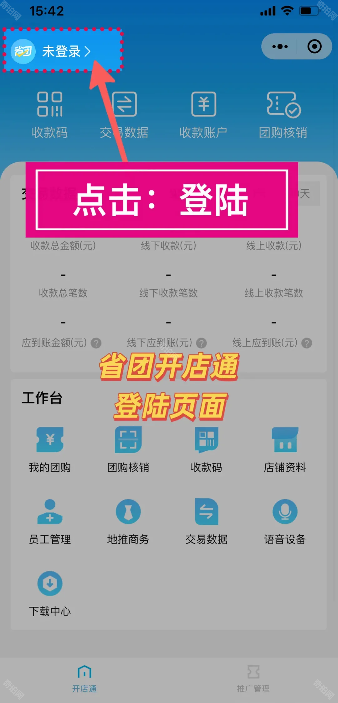 1、首先在各大应用平台下载省团开店通,下载后打开,点击左上角的头像进行账号登录