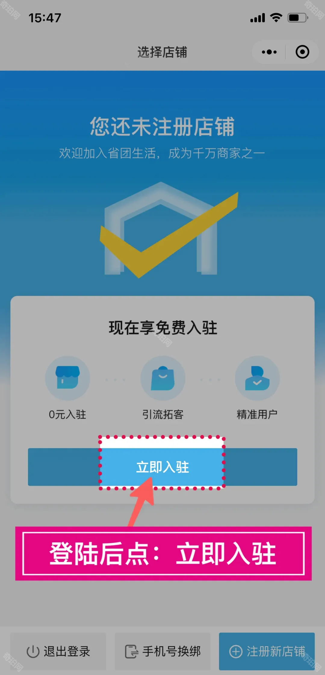 2、登录账号后会显示我们还未注册店铺,点击下方的立即入驻