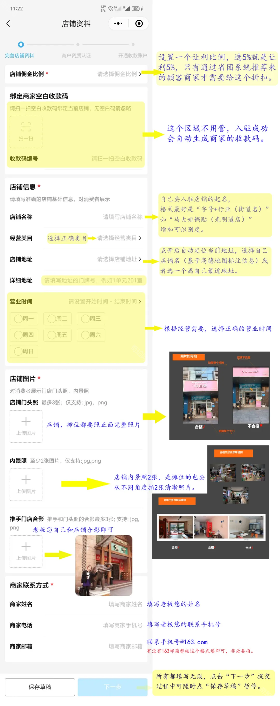 5、最后根据下图中的指引完善店铺信息后点击下一步即可完成入驻流程