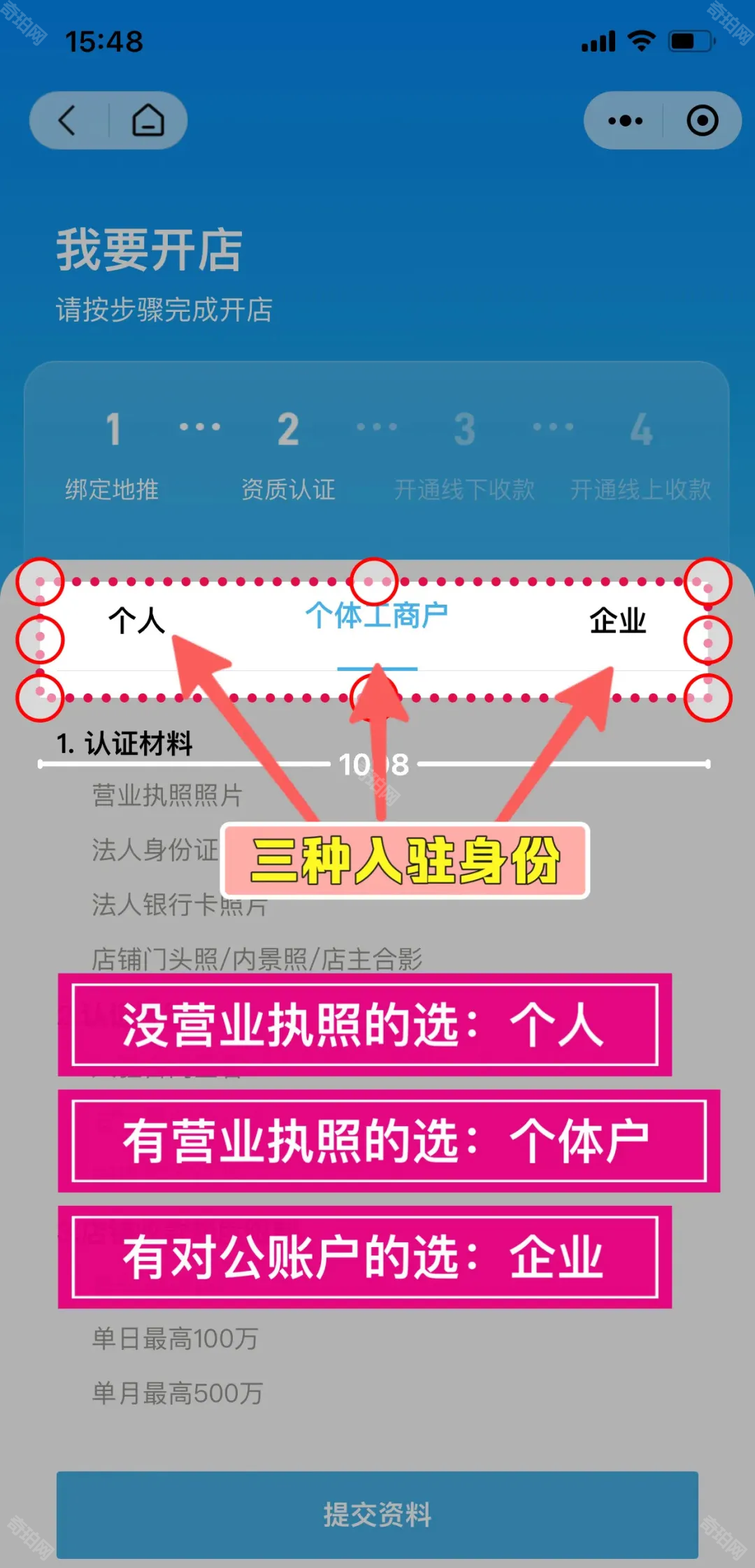 4、然后根据自己的身份选择入驻身份,之后点击底部的提交资料