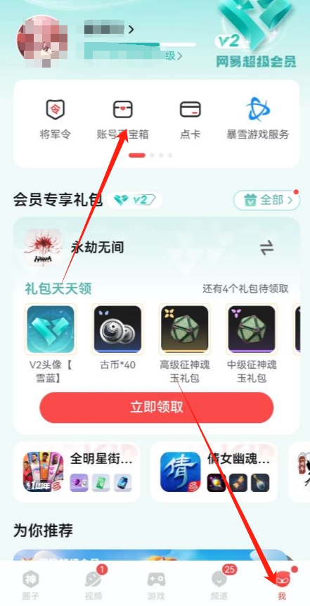 1、首先打开网易大神app,然后点击页面右下角的“我的”,然后点击页面上方的“账号百宝箱”。
