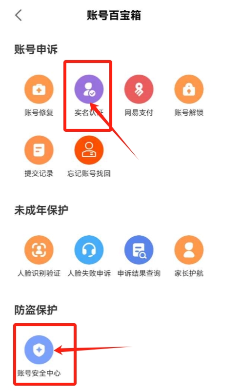 3、然后在账号百宝箱页面点击“实名认证”或者“账号安全中心”。