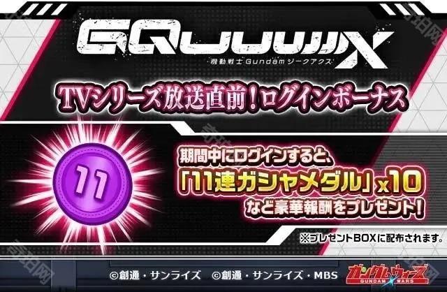 活动期间内登入游戏,即可获得 11 连抽转蛋勋章【《机动战士高达 GQuuuuuuX》TV 开播纪念!转蛋祭典】×10」,玩家可前往礼物箱领取礼物。此外,官方也同步举办 X 抽奖活动,详情可参考官方 X。