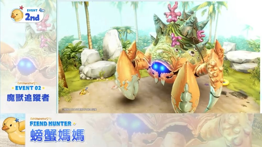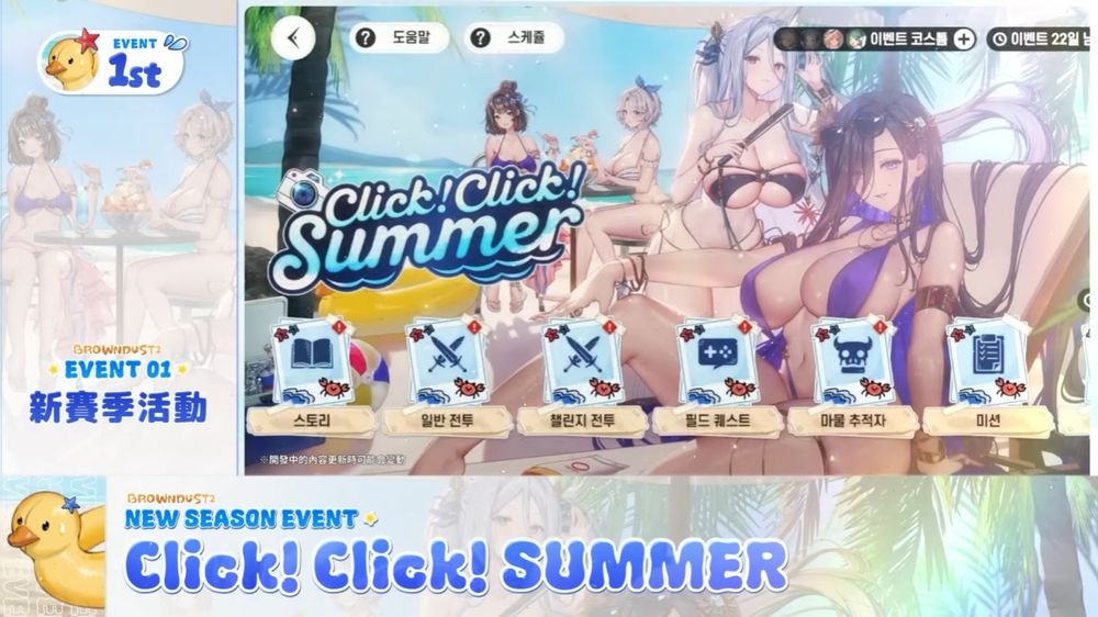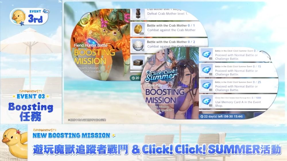 夏季活动《Click! Click! Summer》也进行了更新,将开放到 8 月 29 日。该活动讲述了在海边度假时,为了打倒妨碍的狗仔队而展开行动的着名演员「伊柯利普斯」和「墨菲亚」的故事。同时,还揭开了另一角色「拉菲娜」的隐藏意图。玩家可以享受共 30 场战斗,其中一般战斗和挑战战斗各有 15 场,最终 Boss 为「螃蟹妈妈」。此外,还包括场域任务「海边打西瓜游戏!」。