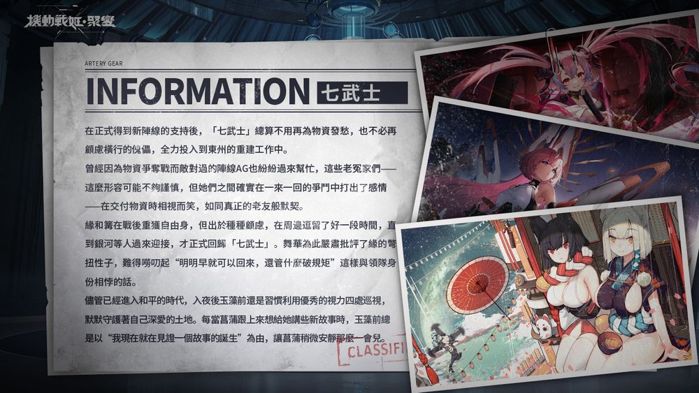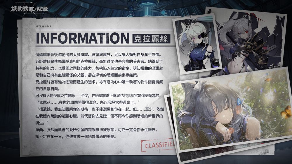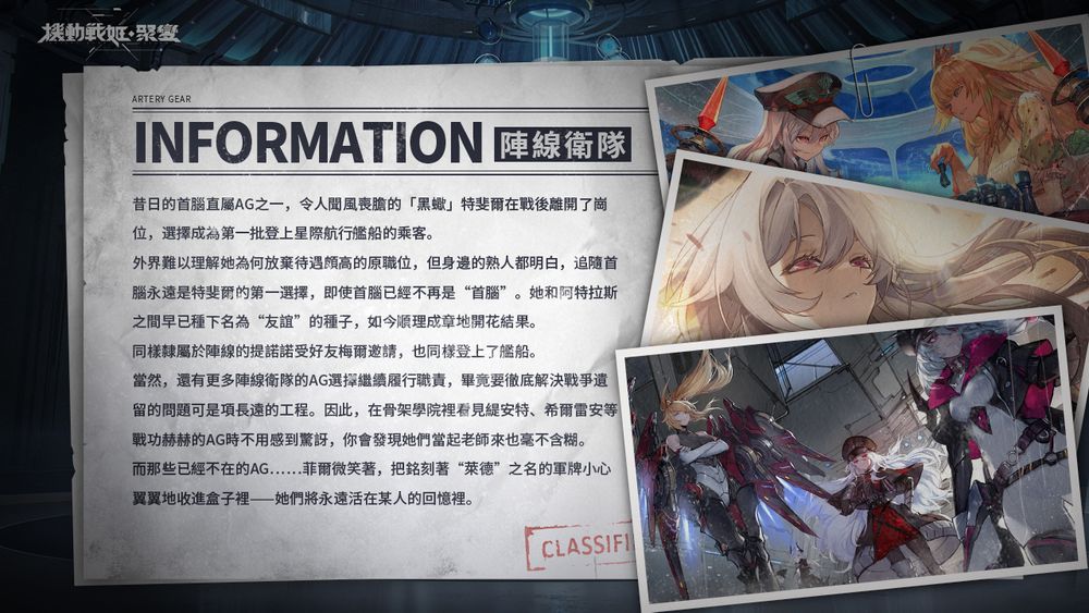 本作的故事背景讲述末日来临,席捲大地的残暴变异体种群──「傀儡」,透过「提缐」同化人类、变异增殖。面对傀儡军团磙雪球式的侵略,代表人类最后希望的两大阵营「奥托露娜」与「阵缐联盟」合作,开发出了克制傀儡的改造少女兵器–AG(Artery Gear),并共同建立联合部队「纽带」。 玩家将以联合部队「纽带」指挥官的身份带领上百位拥有独特技能的机甲少女们组成战斗小队,除了与蚕食世界的傀儡军团展开激战,一步步抽丝剥茧,找出这个世界的真相。