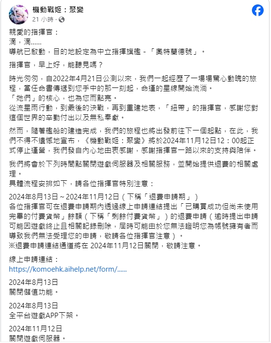 官方表示,《机动战姬:聚变》于 8 月 13 日关闭储值功能、全平台下架,预计 11 月 12 日关闭游戏伺服器,11 月 20 日停止客服相关活动。
