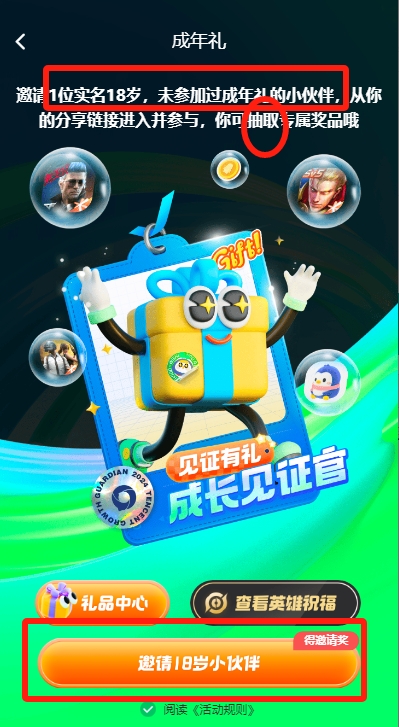 4、成年礼需要邀请一位已满18岁但未参加过成年礼的小伙伴进入链接才可以领取哦,点击“邀请18岁伙伴”。