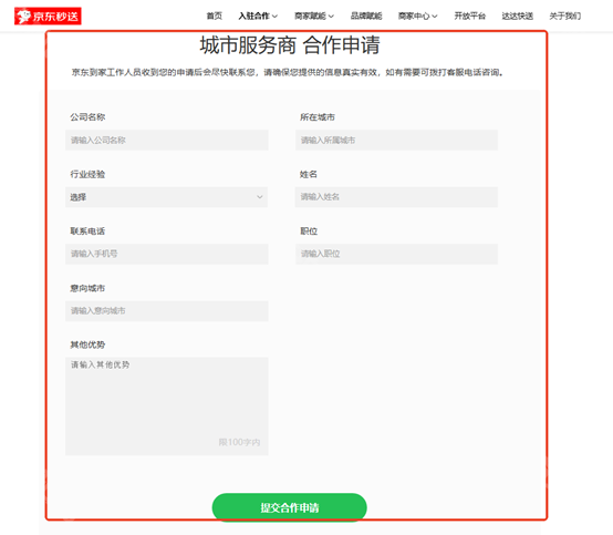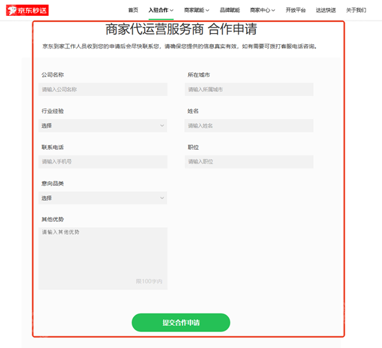 答:前往京东秒送官网-入驻合作-服务商合作-选择要申请的服务商种类-填写合作申请表并提交