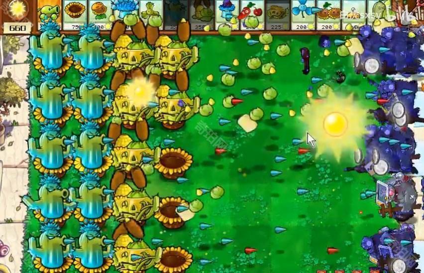 1、还是老操作了,在后排放上阳光花盆种植向日葵组成仙人掌,打不过的放玉米卷香蒲。