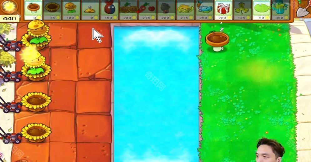 1、这一关的小盆菇是睡着的,我们在水池前面布置上小盆菇,然后在后排依旧种植阳光向日葵,能量是最重要的。