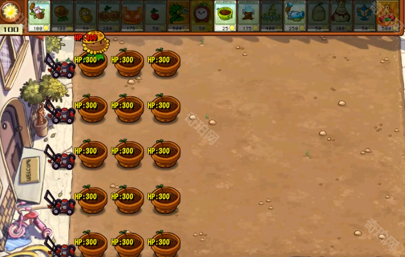 1、在这一关中默认有3排花盆,我们优先种植2排向日葵来获得阳光