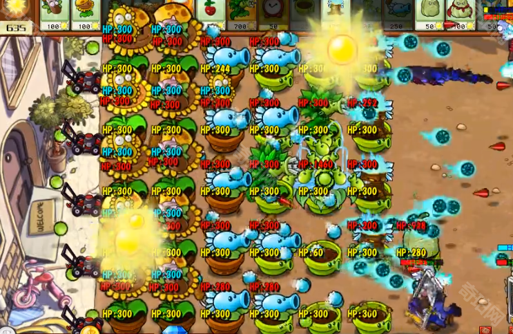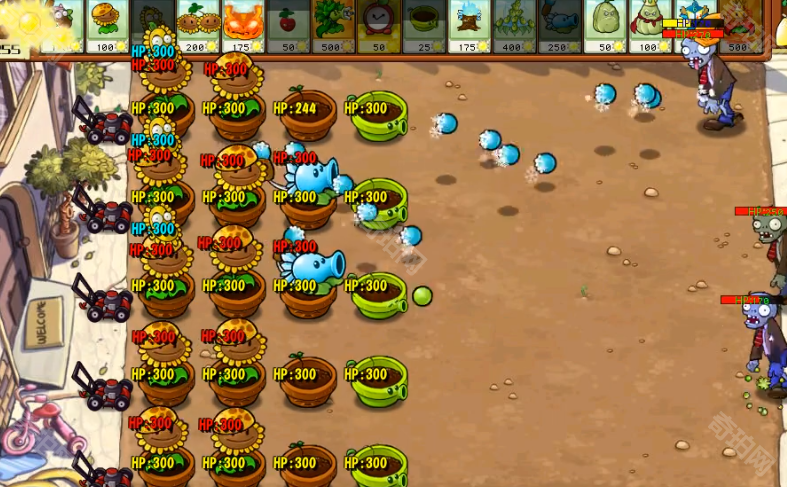 3、最后我们保证2排向日葵,2排寒冰投手,1排火炬即可过关,除了关卡自带的花盆,我们全部种下豌豆射手花盆