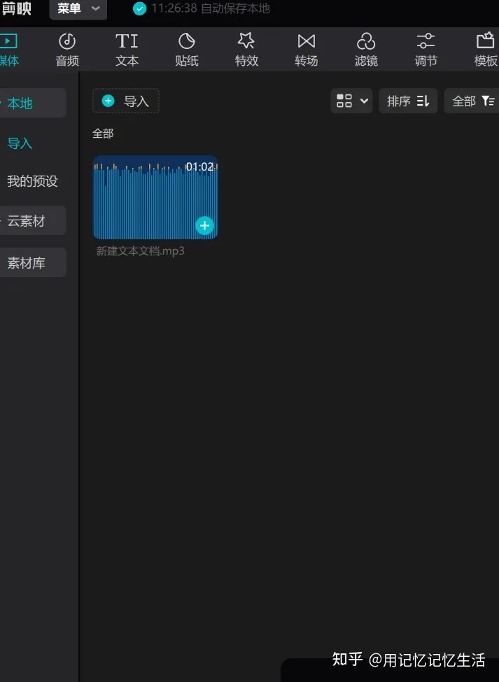 再打开剪映会发现多了个文稿点击多的那个,然后添加声频。调节一下就可以发布