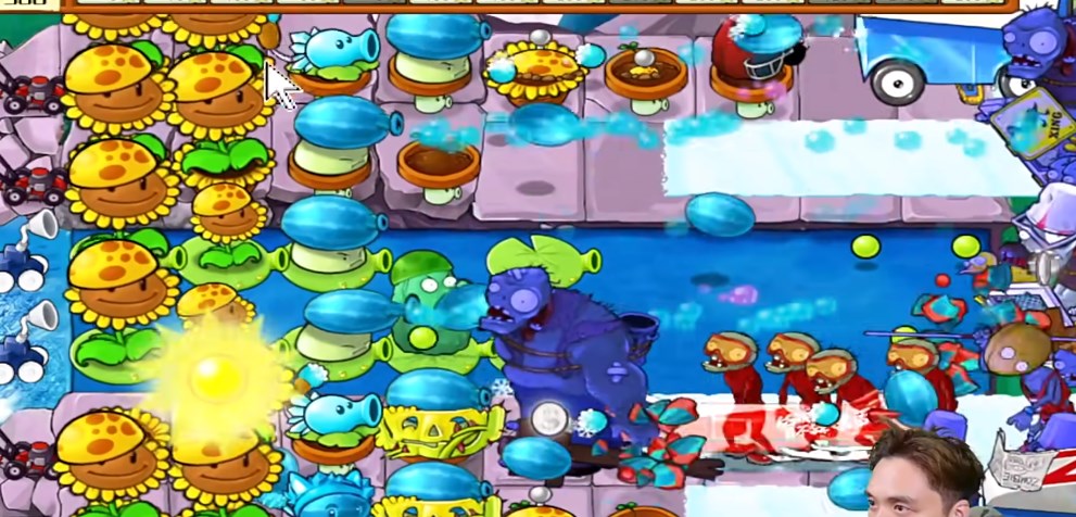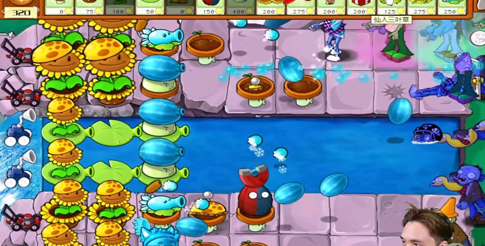 2、建造一些寒冰射手香蒲,在水上安排豌豆睡莲。