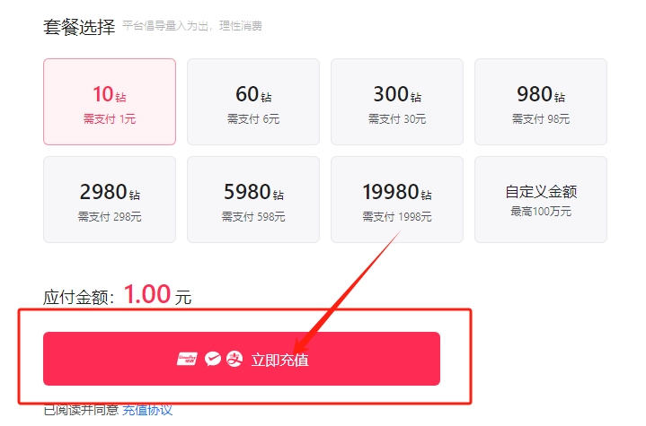 1、复制上方链接来到抖音充值官网,选择自己想要充值的金额,点击“立即充值”。