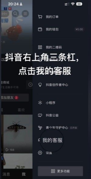 1、进到抖音以后,点击右侧我,选择右上角的三道杠;