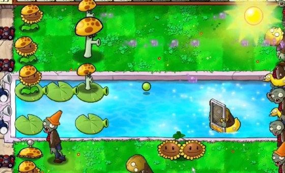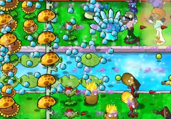 1、这一关首先在河道上面设置胆小菇,旁边道路注意观察,如果有僵尸出现也要及时建立胆小菇。