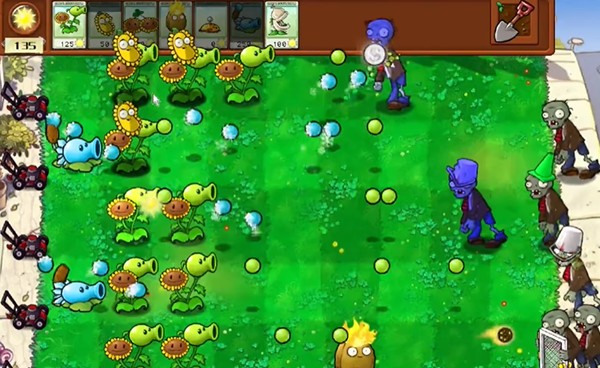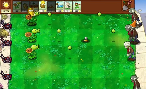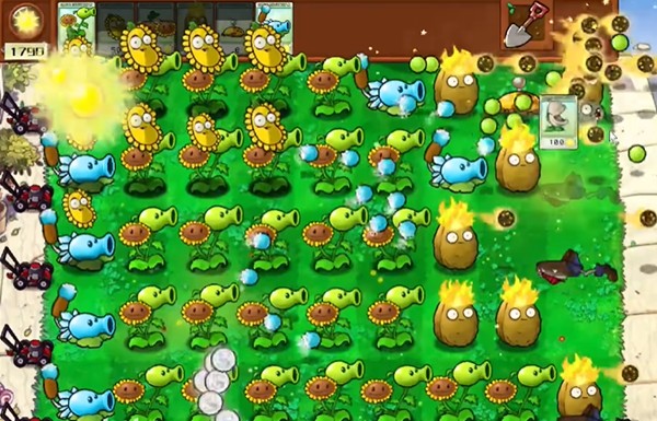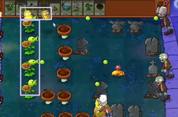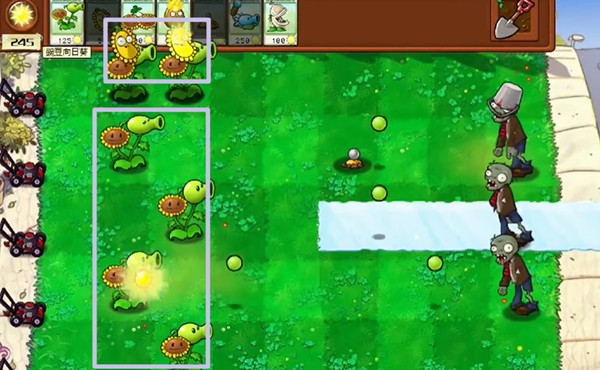 3、多安排一些豌豆向日葵,这个价格比较低,基本每排都有两个之后在最后一排安排寒冰香蒲射手。