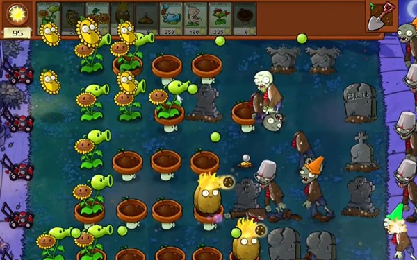 2、然后向日葵积累足够太阳之后,尽量每条道路都安排一个豌豆向日葵,如果僵尸比较难打,就在前方安排一个土豆。
