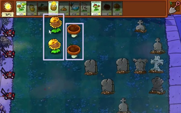 1、这一关我们可以发现地图上面有着很多的墓碑,我们在前期尽量多布置一点不要钱的小盆菇,然后小盆菇后面设置向日葵,快速收集太阳。