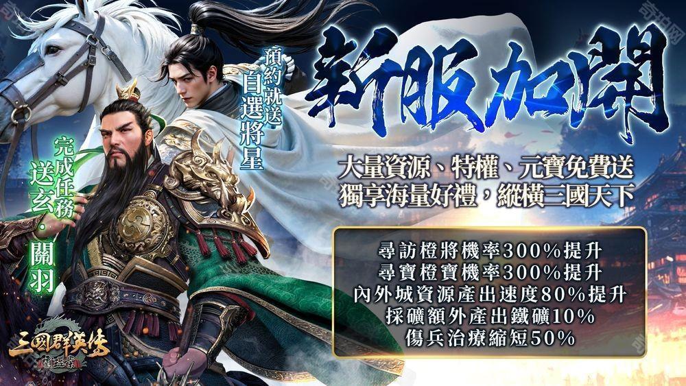 全新服务器专属活动「王图霸业」!与新服务器玩家一起进行多种挑战内容,在竞争领地的同时,也要合作完成挑战,考验您的领导力与团队合作。挑战内容精彩丰富,包括累计讨伐流寇总数、全服累计总兵力、以及联盟成员的宫城等级达到指定条件等多项任务。只要共同完成任务目标,便可获得海量稀有道具,如加速资源、兵法书、随机星宿石礼包等,还将有机会获得「玄.关羽」和「刘备」等知名三国武将。