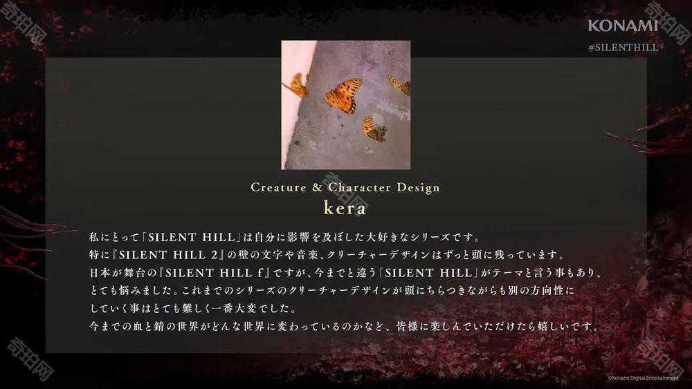 他在留言内提到:「《寂静岭 f》的故事背景并非是以往的欧美小镇,而是搬到了日本,这让我在设计时烦恼了许久。毕竟要跳脱系列作的框架去设计风格迥异的怪物,不是件容易的事情。这次的作品究竟和从前那以血迹和生锈金属所构成的世界有何不同之处?还请大家实际游玩来一探究竟。」