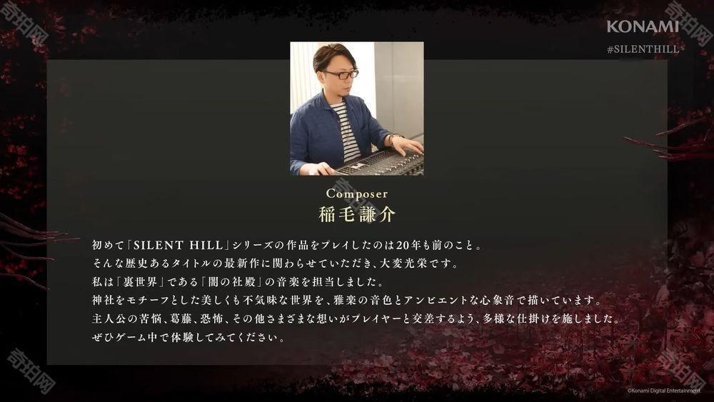 而负责「里世界」也就是「黑暗社殿」音乐制作的稻毛谦介则表示,自己第一次玩「寂静岭」系列的作品已经是 20 年前的事了,能够参与这个悠久歷史的系列最新作是极大的荣幸。他将透过雅乐的音色与氛围感十足的心象音,来描绘以神社为主题的美丽又诡异的世界,并设计了多种音乐表现方式,让主角的苦恼、纠结、恐惧,以及各种情感能够与玩家的感受有所交集。