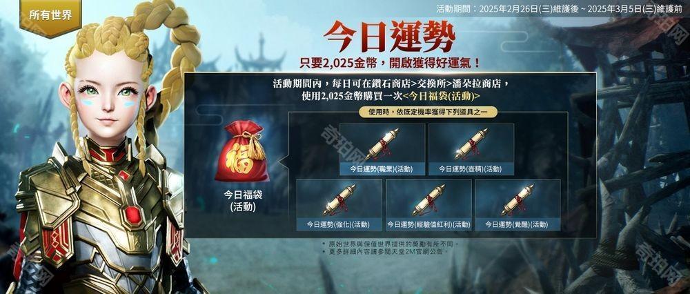 所有世界【今日运势】:2/26 维护后~3/5 维护前,活动期间内,每日可在钻石商店→交换所→潘朵拉商店,使用 2,025 金币购买一次「今日福袋 (活动)」;使用时,依既定机率获得下述道具之一: