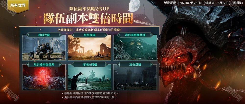 全服务器【队伍副本双倍时间】:2/26 维护后~3/5 维护前,活动期间内,完成队伍副本时可以获得 2 倍最终奖励「首领秘密箱」。